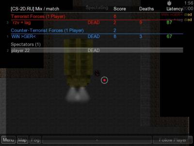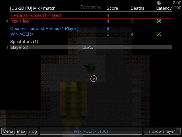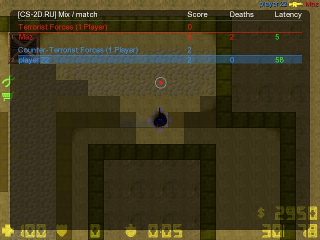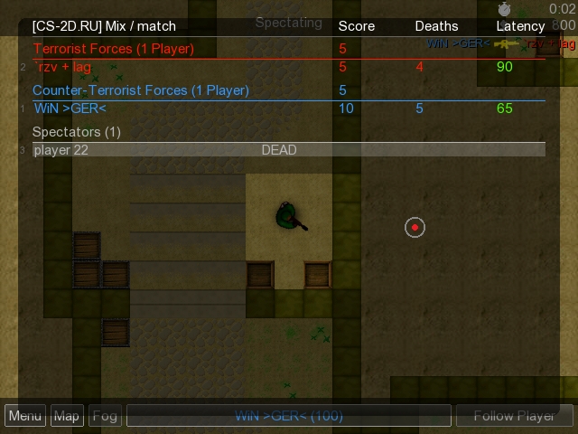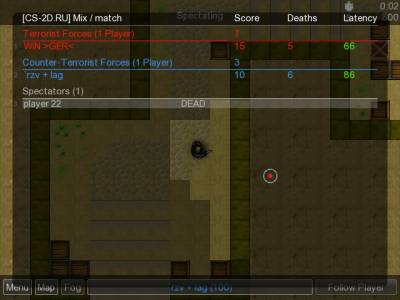 The map was aim_freekz and scores looks like Maz - Firzen 1st half 5-5 2nd half 6-4 total: 11-9 Fortunately, I was able to spectate and screen their 2nd map, de_desert. Maz - Firzen 1st half 8-2 2nd half 6-4 total: 14-6